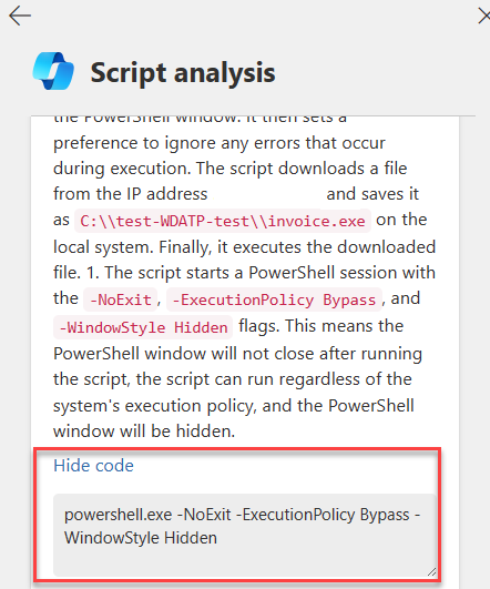 Copilot analyserer scriptet og viser resultaterne på scriptanalysekortet. Brugerne kan vælge Vis kode for at få vist bestemte kodelinjer, der er relateret til analysen. Hvis du vil skjule koden, skal brugerne kun vælge Skjul kode.