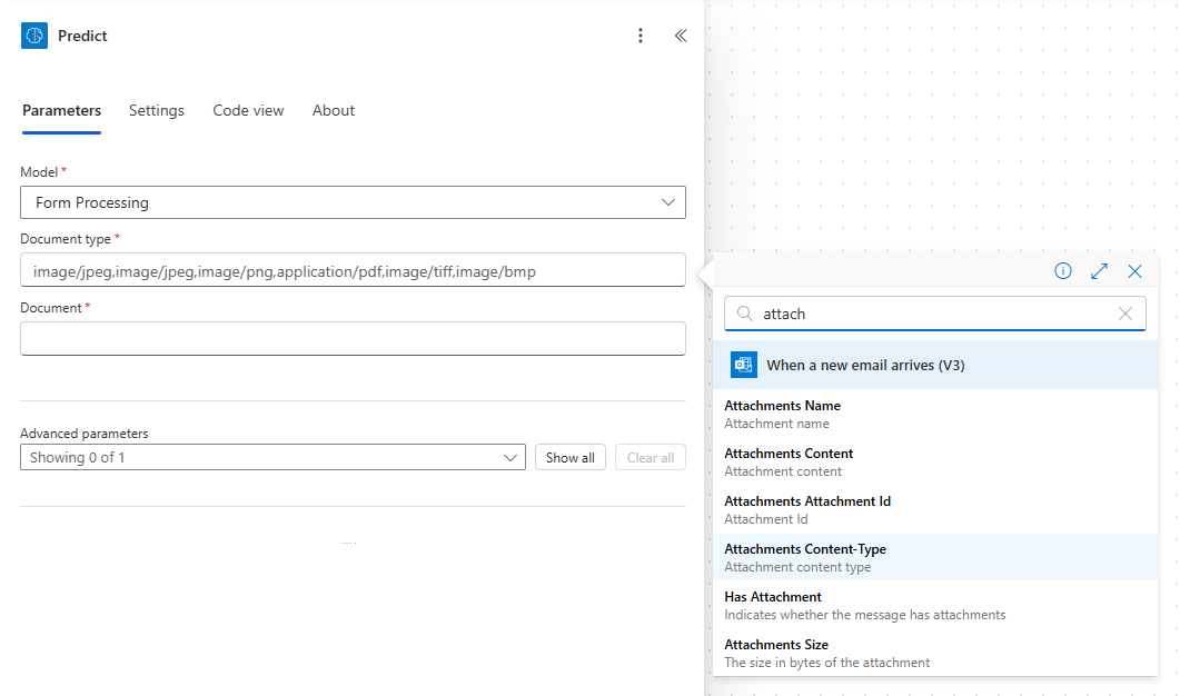 Select the model that you want to use, which in this case is Form Processing. After your model is selected, more fields will appear. For the form processing model, a document is required. Because this flow is triggered by receiving an email with an attachment, you can specify that attachment with dynamic content. For the document type, search for and select Attachments Content-Type in the Dynamic content menu.
