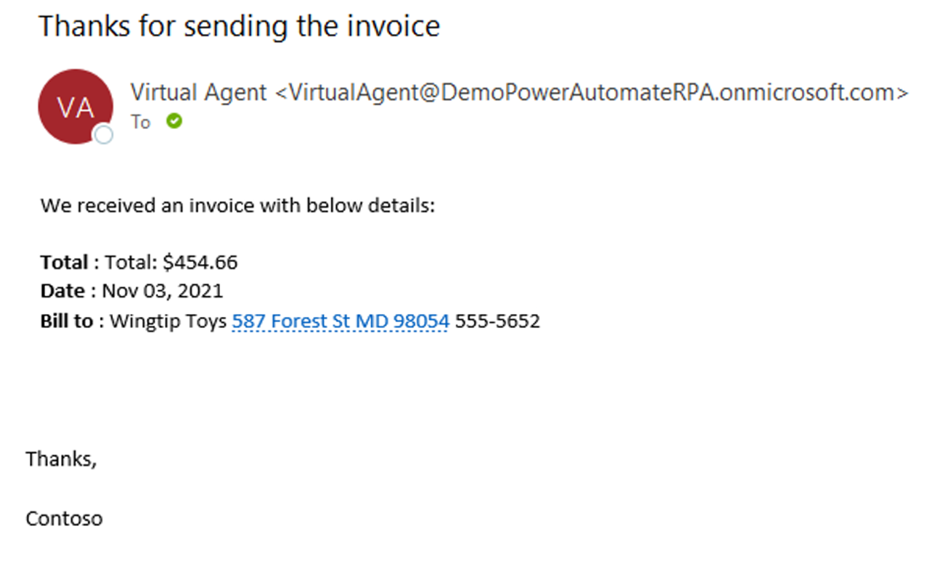 Use Thanks for sending the invoice for the Subject. The body will be a mix of text and dynamic content from the AI model. The following screenshot shows an example of the end result. The model has a display name and a value for each field. Select Save.
