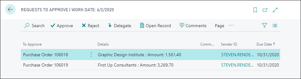 You can process approval requests on the Requests to Approve page, for example, to approve multiple requests simultaneously. Alternatively, you can process each request on the related record, such as the Purchase Order page, by selecting the link in the notification that you receive.
