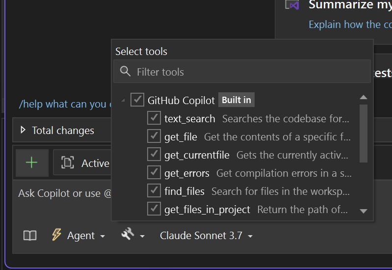 Agent mode can use the following tools for responding to a request: