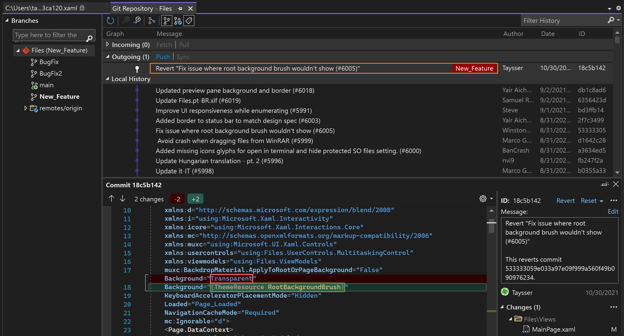 In the previous example, the commands will undo the changes made in commit 53333305 and create a new commit on the branch. The original commit is still in the Git history. To do the same in Visual Studio, right-click the commit you want to revert and then select Revert. After you confirm your action and the operation is complete, Visual Studio displays a success message and a new commit appears in the Outgoing section.