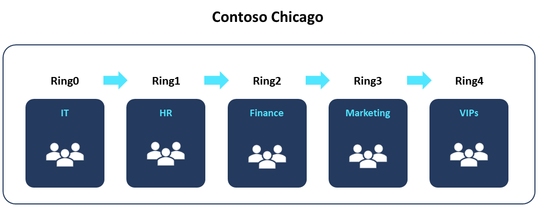 | You're working as the IT admin at Contoso Ltd. Your branch location in Chicago needs to plan a gradual rollout of software updates within specific departments to make sure the Chicago office doesn’t experience disruptions in its operations. | You can create an Autopatch group for the branch location in Chicago and breakdown the deployment ring composition per the departments within the branch location. The following is a visual representation of a gradual rollout for the Contoso Chicago branch location. |
