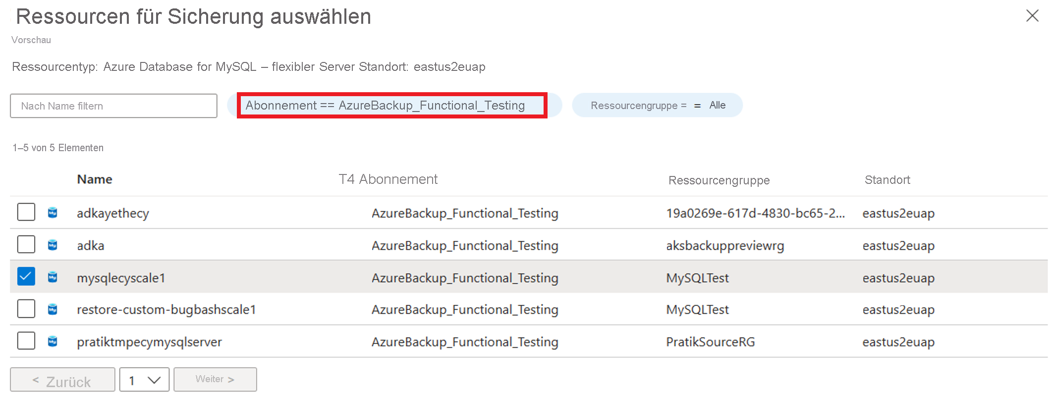 Sie können einen flexiblen Azure-Datenbankserver für MySQL für Abonnements auswählen, wenn er sich in derselben Region wie der Tresor befindet.