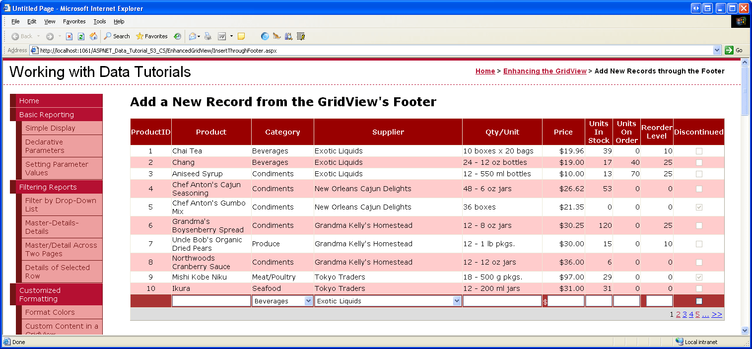 Nachdem der Inserting Ereignishandler abgeschlossen wurde, können der Datenbanktabelle neue Datensätze über die Products Fußzeile von GridView hinzugefügt werden. Fahren Sie fort, und versuchen Sie, mehrere neue Produkte hinzuzufügen.
