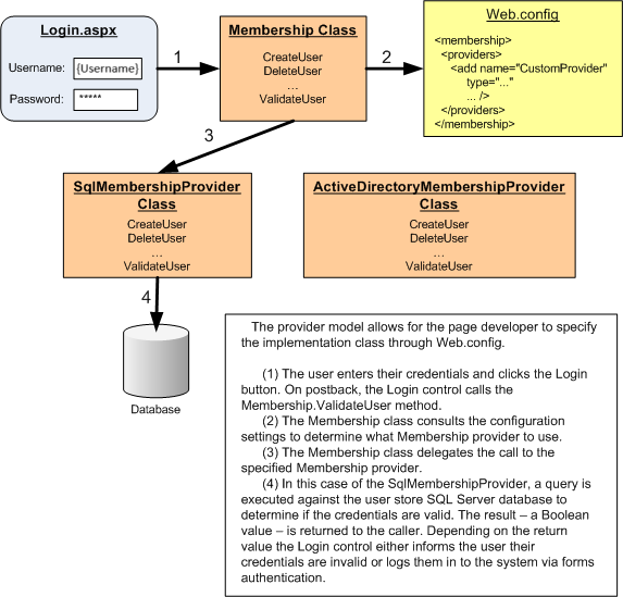 Das Mitgliedschaftsframework verwendet das Anbietermodell, das die API des Mitgliedschaftsframeworks sauber von der Implementierung trennt. Auf diese Weise können Entwickler eine allgemeine API verwenden, sie können jedoch eine Implementierung verwenden, die den benutzerdefinierten Anforderungen ihrer Anwendung entspricht. Kurz gesagt definiert die Membership-Klasse die wesentlichen Funktionen des Frameworks (methoden, Eigenschaften und Ereignisse), stellt jedoch keine Implementierungsdetails bereit. Stattdessen rufen die Methoden der Membership-Klasse den konfigurierten Anbieter auf, was die eigentliche Arbeit ausführt. Wenn beispielsweise die CreateUser-Methode der Mitgliedschaftsklasse aufgerufen wird, kennt die Membership-Klasse nicht die Details des Benutzerspeichers. Es ist nicht bekannt, ob Benutzer in einer Datenbank oder in einer XML-Datei oder in einem anderen Speicher verwaltet werden. Die Membership-Klasse untersucht die Konfiguration der Webanwendung, um zu bestimmen, an welchen Anbieter der Aufruf delegiert werden soll, und diese Anbieterklasse ist für die tatsächliche Erstellung des neuen Benutzerkontos im entsprechenden Benutzerspeicher verantwortlich. Diese Interaktion wird in Abbildung 3 veranschaulicht.