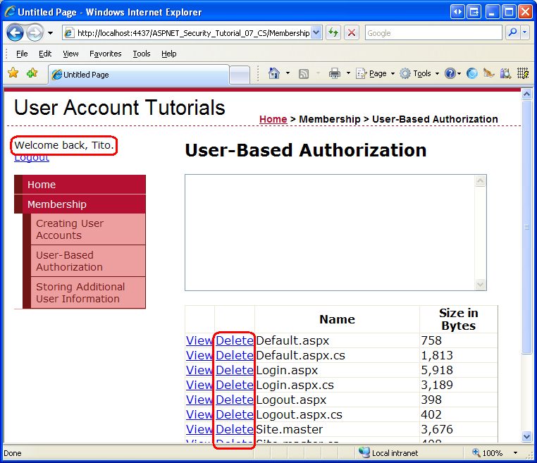 Derzeit können alle authentifizierten oder anonymen Benutzer die UserBasedAuthorization.aspx Seite besuchen und Dateien anzeigen oder löschen. Lassen Sie uns es so gestalten, dass nur authentifizierte Benutzer Inhalte einer Datei anzeigen können und nur Tito eine Datei löschen kann. Solche Feinkornautorisierungsregeln können deklarativ, programmgesteuert oder durch eine Kombination beider Methoden angewendet werden. Lassen Sie uns den deklarativen Ansatz verwenden, um einzuschränken, wer den Inhalt einer Datei anzeigen kann; wir verwenden den programmgesteuerten Ansatz, um einzuschränken, wer eine Datei löschen kann.