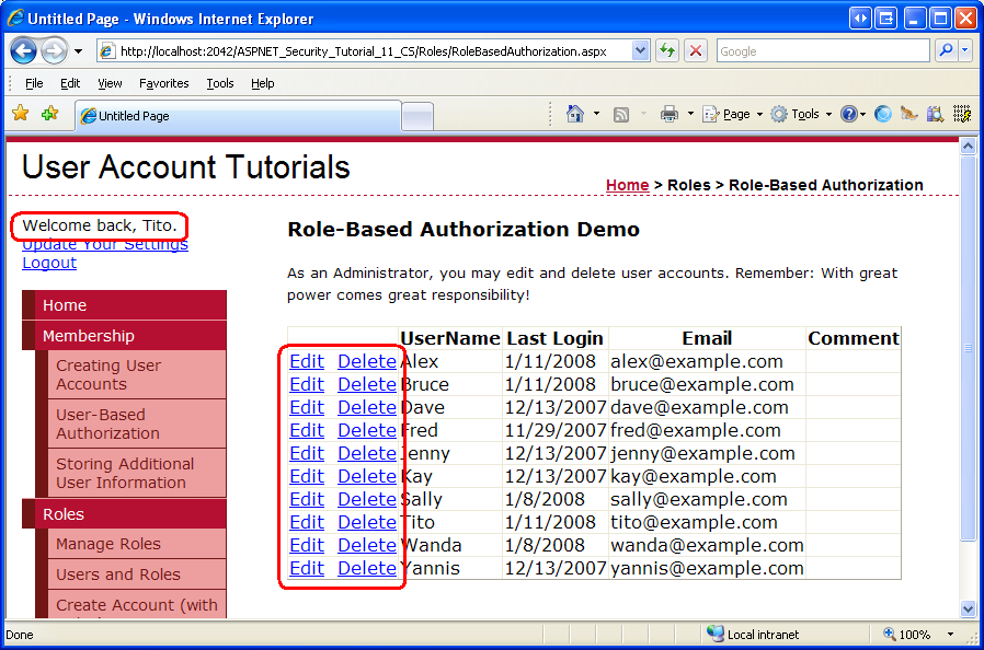 Wir haben uns die Verwendung des PrincipalPermission Attributs im Tutorial zur benutzerbasierten Autorisierung angesehen. Insbesondere haben wir gesehen, wie der -Ereignishandler von GridView SelectedIndexChanged und RowDeleting so ergänzt wird, dass sie nur von authentifizierten Benutzern bzw. Tito ausgeführt werden können. Das PrincipalPermission Attribut funktioniert genauso gut mit Rollen.