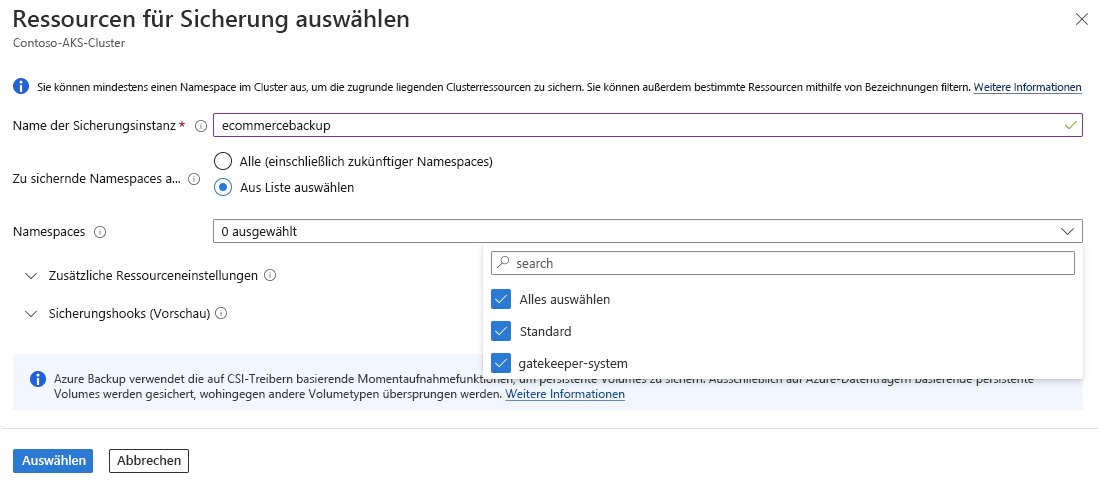 Definieren Sie im Bereich Zu sichernde Ressourcen auswählen die Clusterressourcen, die Sie sichern möchten.