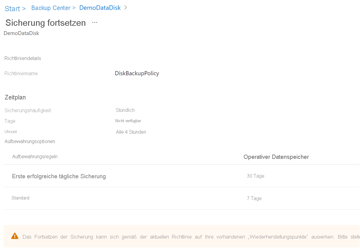 Wenn Sie den Schutz einer Sicherungsinstanz fortsetzen, wird die vorhandene Sicherungsrichtlinie nur auf neue Wiederherstellungspunkte angewendet. Wiederherstellungspunkte, die basierend auf ihrer ursprünglichen Aufbewahrungsdauer bereits abgelaufen sind, wie durch die Sicherungsrichtlinie zum Zeitpunkt ihrer Erstellung definiert, werden bereinigt.