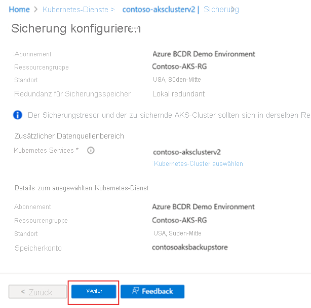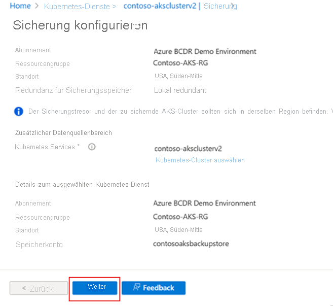TrustedAccessPreviewfür denMicrosoft.ContainerServices-Ressourcenanbieter im Abonnement.Wählen Sie eine Sicherungsrichtlinie aus, die den Zeitplan für Sicherungen und ihre Aufbewahrungsdauer definiert. Wählen Sie Weiteraus.