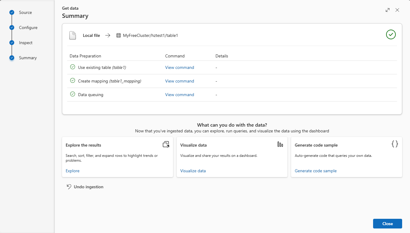 Im Fenster "Datenvorbereitung " zeigen alle drei Schritte grüne Häkchen an, wenn die Datenaufnahme erfolgreich abgeschlossen ist. Sie können die Befehle anzeigen, die jeder Schritt verwendet hat, oder eine Karte auswählen, um die aufgenommenen Daten abzufragen, zu visualisieren oder abzulegen.
