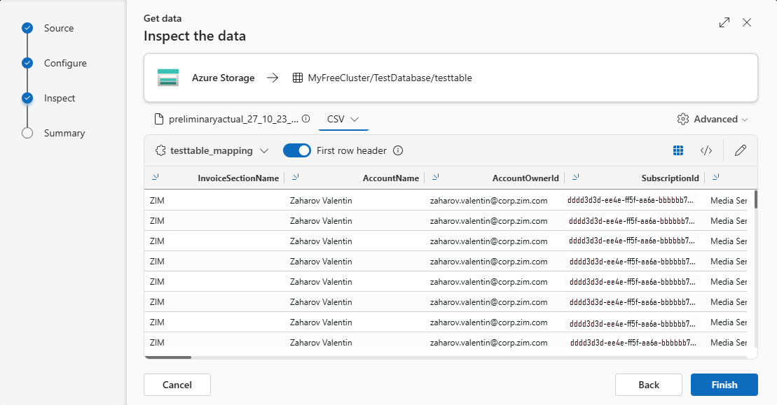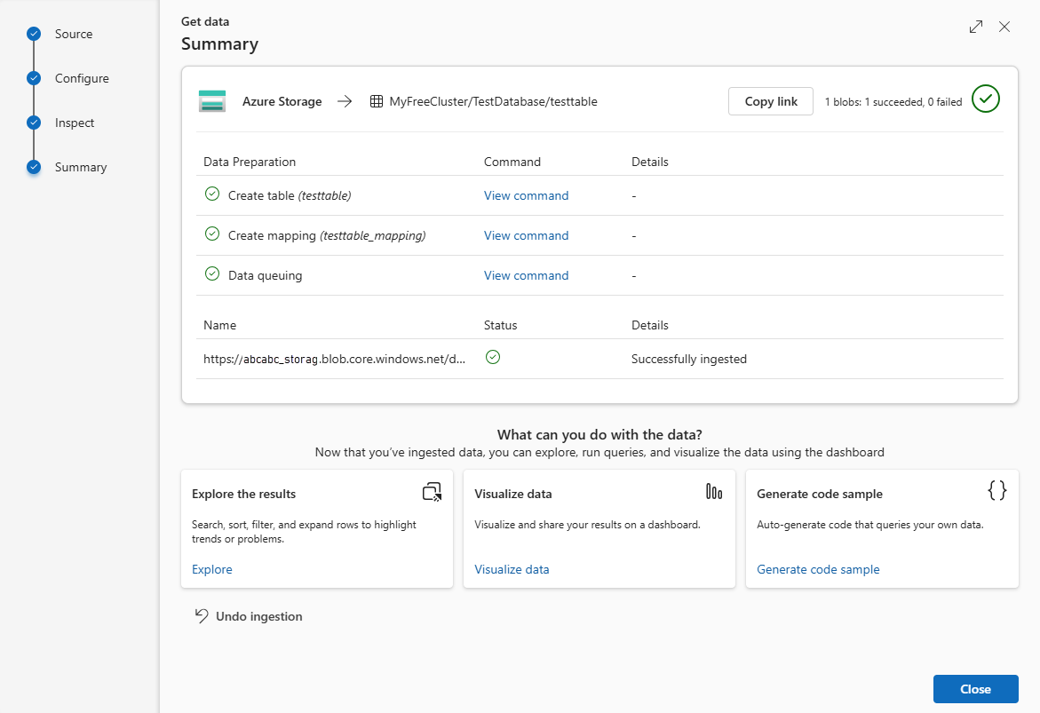 Die Datenaufnahme ist der Prozess, der zum Laden von Daten aus einer oder mehreren Quellen in eine Tabelle im Azure-Daten-Explorer verwendet wird. Nach der Erfassung stehen die Daten für die Abfrage zur Verfügung. In diesem Artikel erfahren Sie, wie Sie Daten aus Azure-Speicher (ADLS Gen2-Container, Blobcontainer oder einzelnen Blobs) in eine neue oder vorhandene Tabelle abrufen.