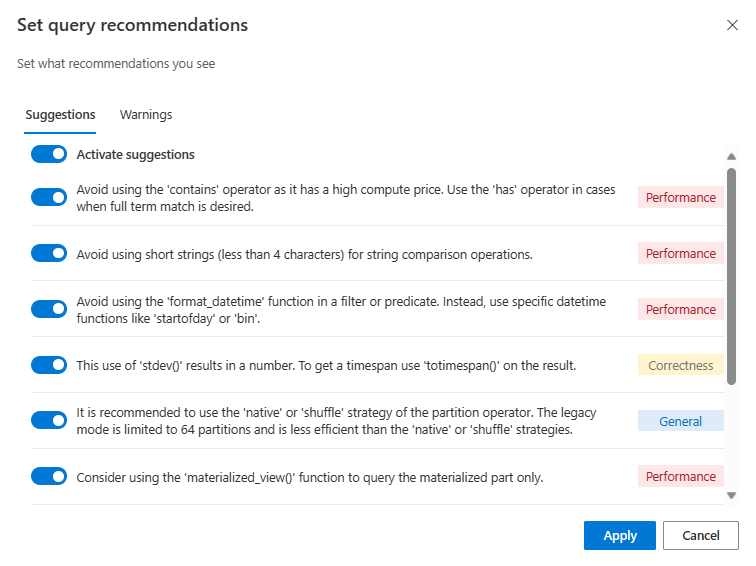 Aktivieren oder deaktivieren Sie im Dialogfeld Abfrageempfehlungen spezifische Vorschläge und Warnungen. Verwenden Sie Aktivieren von Vorschlägen und Warnungen aktivieren oben auf den jeweiligen Registerkarten, um alle Vorschläge oder Warnungen gleichzeitig zu aktivieren oder zu deaktivieren.