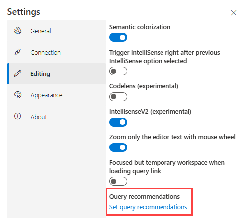 Der Abfrageeditor stellt Vorschläge und Warnungen bereit, während Sie Ihre Abfragen schreiben. Die Vorschläge und Warnungen können sich auf Leistung, Korrektheit oder allgemeine bewährte Methoden beziehen. Führen Sie die folgenden Schritte aus, um Ihre Vorschläge und Warnungen anzupassen: