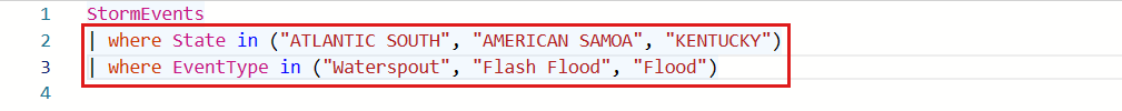 StormEvents | where DamageProperty > 5000 | take 1000Wählen Sie im oberen Menü des Ergebnisrasters auf der rechten Seite "Suchen" aus, und geben Sie "Wabash" ein.
