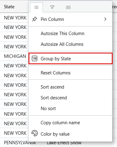 StormEvents | where EventType == "Lake-Effect Snow"Zeigen Sie mit der Maus auf die Spalte State (Bundesstaat), und wählen Sie das Menü und dann Group by State (Nach Bundesstaat gruppieren) aus.