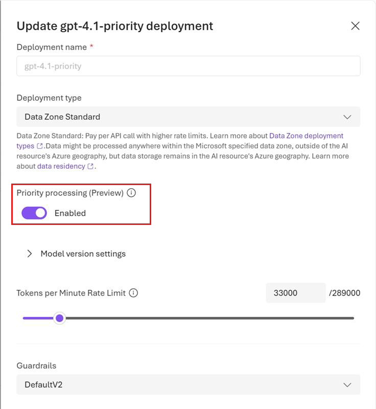 Aktivieren Sie im Microsoft Foundry-Portal die Option "Prioritätsverarbeitung " auf der Seite "Bereitstellungsdetails", wenn Sie die Bereitstellung erstellen oder die Einstellung eines bereitgestellten Modells aktualisieren, indem Sie die Bereitstellungsdetails bearbeiten.