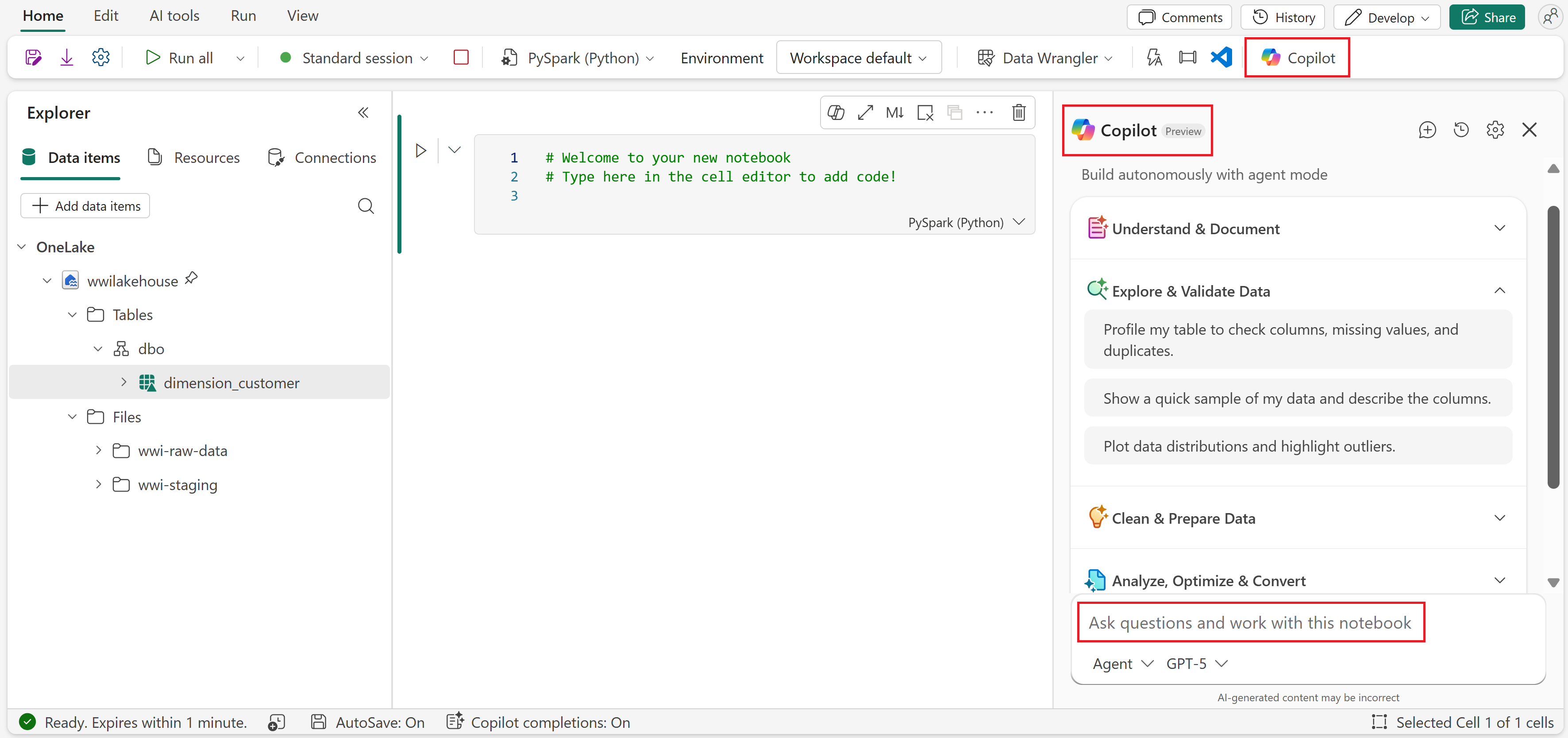 Wenn Sie ein Notizbuch öffnen, Copilot verwendet automatisch Notizbuchkontext wie Ihren Arbeitsbereich, angefügtes Lakehouse, verfügbare Schemas, Tabellen und Dateien, vorhandenen Notizbuchcode und Laufzeit.