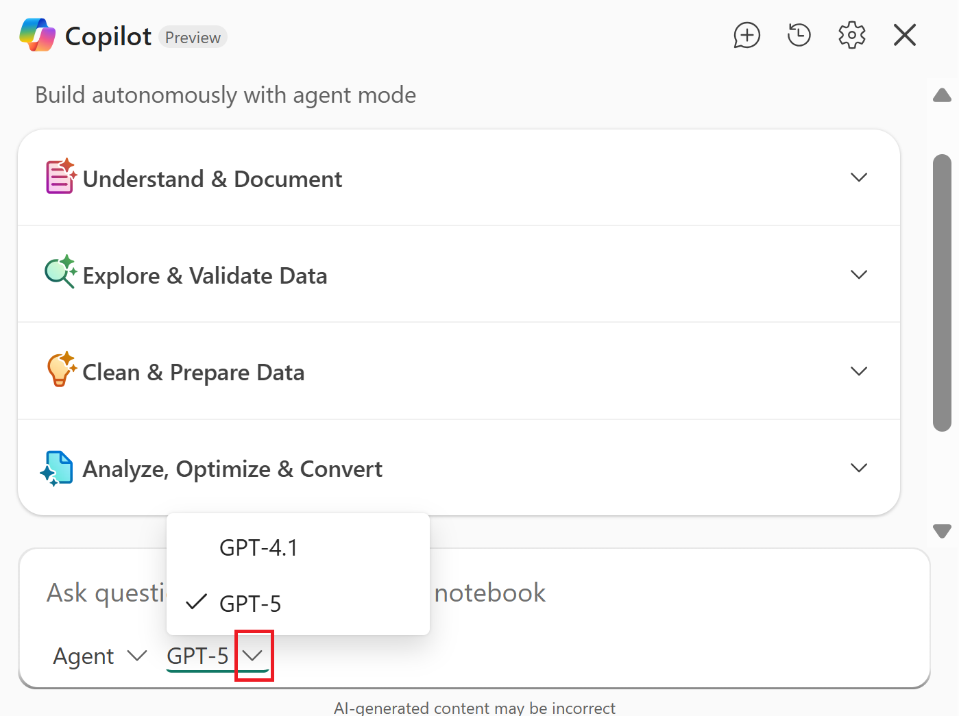 In dieser exemplarischen Anleitung wird der Kernablauf des Chatbereichs behandelt. Der Chatbereich unterstützt auch den Chatverlauf zur Überprüfung früherer Unterhaltungen, und Sie können direkt innerhalb der Zellen interagieren Copilot, indem Sie Aufgaben wie reparieren, erläutern oder optimieren von Code verwenden.
