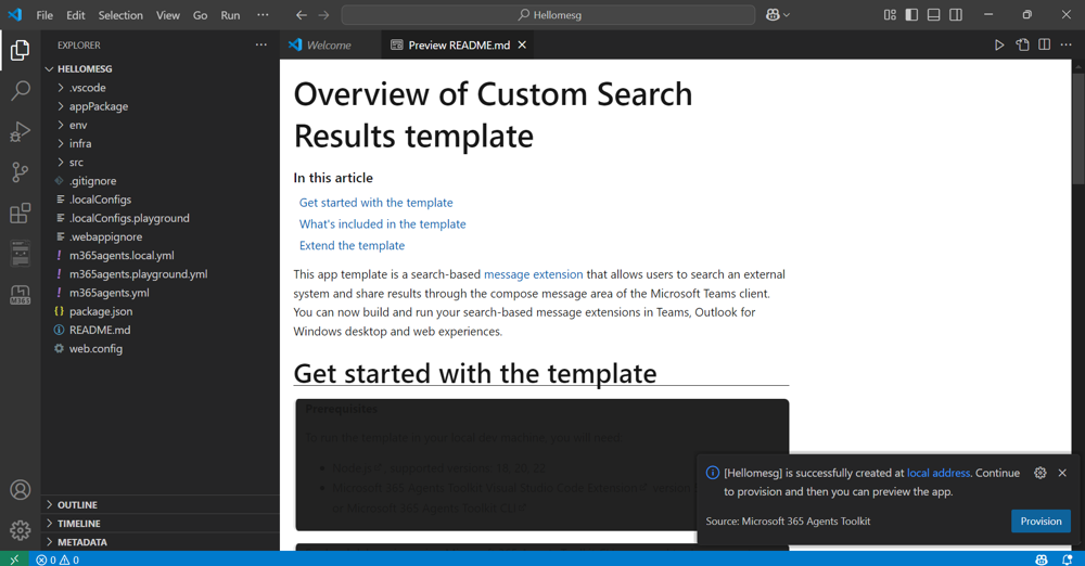 Nachdem Ihre App erstellt wurde, zeigt das Agents Toolkit die folgende Meldung an: