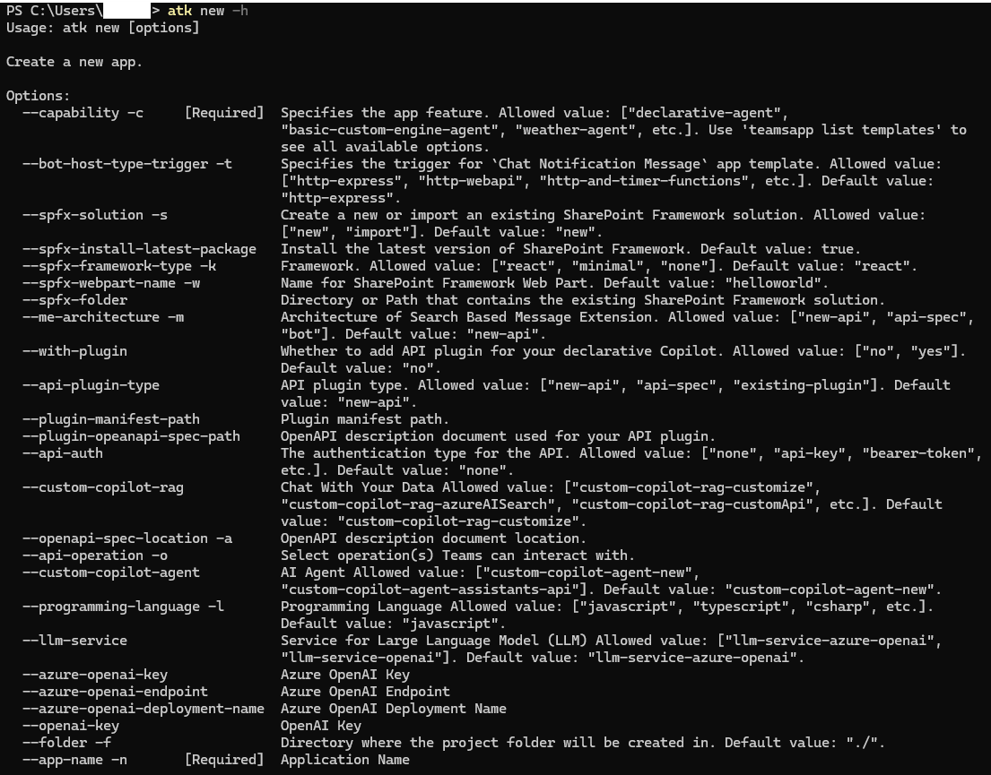 Der atk new Befehl arbeitet standardmäßig im interaktiven Modus und bietet Anleitungen zum Erstellen einer neuen Microsoft 365-App. Um in einem nicht interaktiven Modus zu arbeiten atk new , legen Sie das --interactive Flag auf fest false.