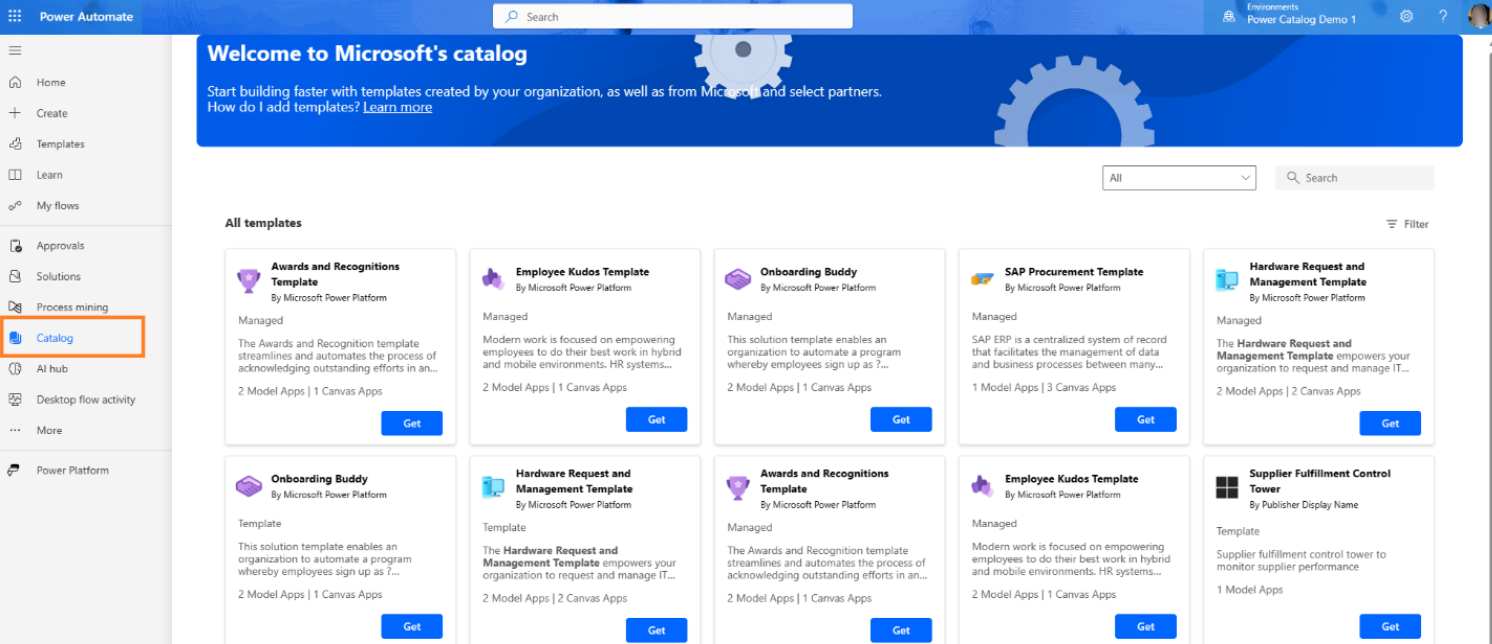 In jeder Organisation gibt es möglicherweise viele Komponenten und Vorlagen, die in vielen Umgebungen verteilt sind. Der Katalog in Power Platform ermöglicht Entwicklern und Erstellern Folgendes: