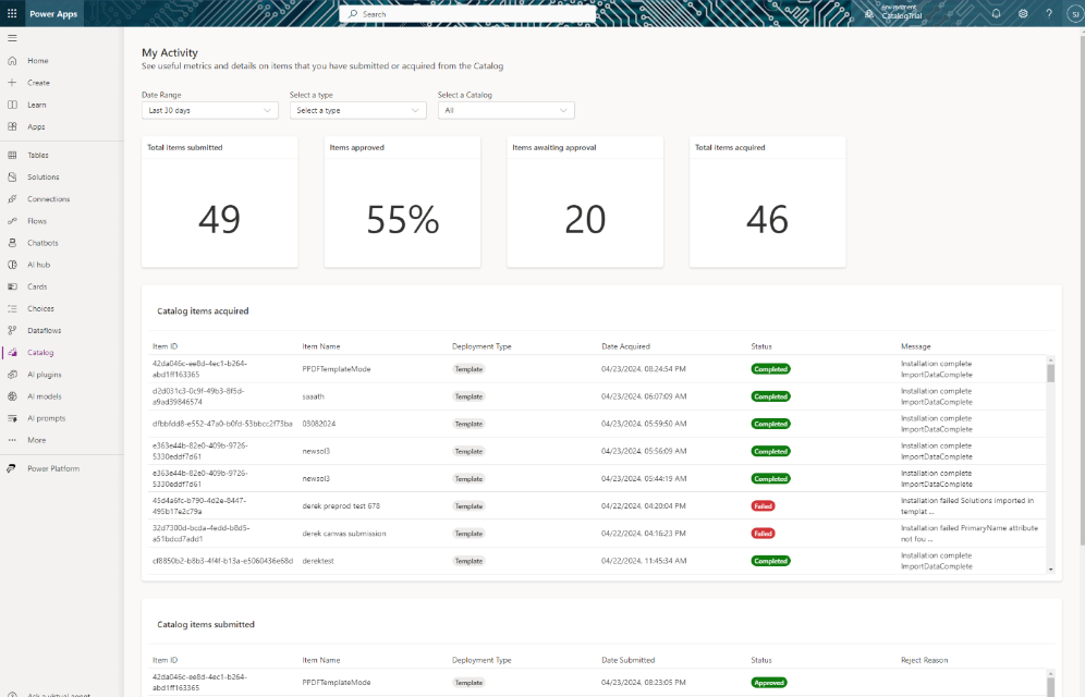 Verknüpft im Banner der Katalogseite ist die Seite "Meine Aktivität ". Dies zeigt nützliche Informationen zu Elementen, die Sie übermittelt und erworben haben, einschließlich des Genehmigungsstatus.