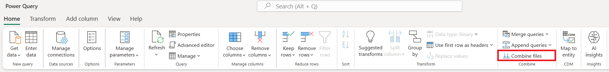 Alternativ können Sie transformationsdaten auswählen, um auf den Power Query-Editor zuzugreifen und eine Teilmenge der Liste der Dateien zu erstellen (z. B. mithilfe von Filtern in der Ordnerpfadspalte, um nur Dateien aus einem bestimmten Unterordner einzuschließen). Kombinieren Sie dann Dateien, indem Sie die Spalte auswählen, die die Binärdateien in der Spalte "Inhalt " enthält, und dann eine der folgenden Optionen auswählen: