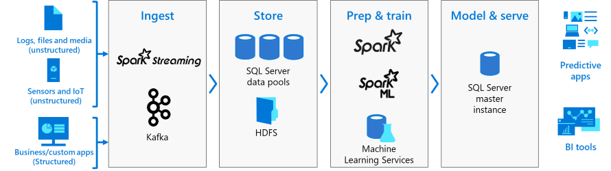 Big Data-Cluster für SQL Server ermöglichen AI- und Machine Learning-Aufgaben für die Daten, die in HDFS-Speicherpools und den Datenpools gespeichert werden. Mithilfe von R, Python, Scala oder Java können Sie sowohl Spark als auch integrierte KI-Tools in SQL Server verwenden.