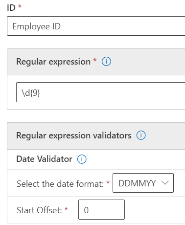 Wenn ein Datumswert, der in einen regulären Ausdruck eingebettet ist, Teil eines neuen Musters ist, das Sie erstellen, können Sie das Datumsüberprüfungssteuerelement verwenden, um zu testen, ob dieser Datumswert Ihren Kriterien entspricht. Sie möchten z. B. eine SIT für eine neunstellige Mitarbeiteridentifikationsnummer erstellen. Die ersten sechs Ziffern sind das Einstellungsdatum im DDMMYYY-Format und die letzten drei sind zufällig generierte Zahlen. Führen Sie die folgenden Schritte aus, um zu überprüfen, ob die ersten sechs Ziffern das richtige Format aufweisen: