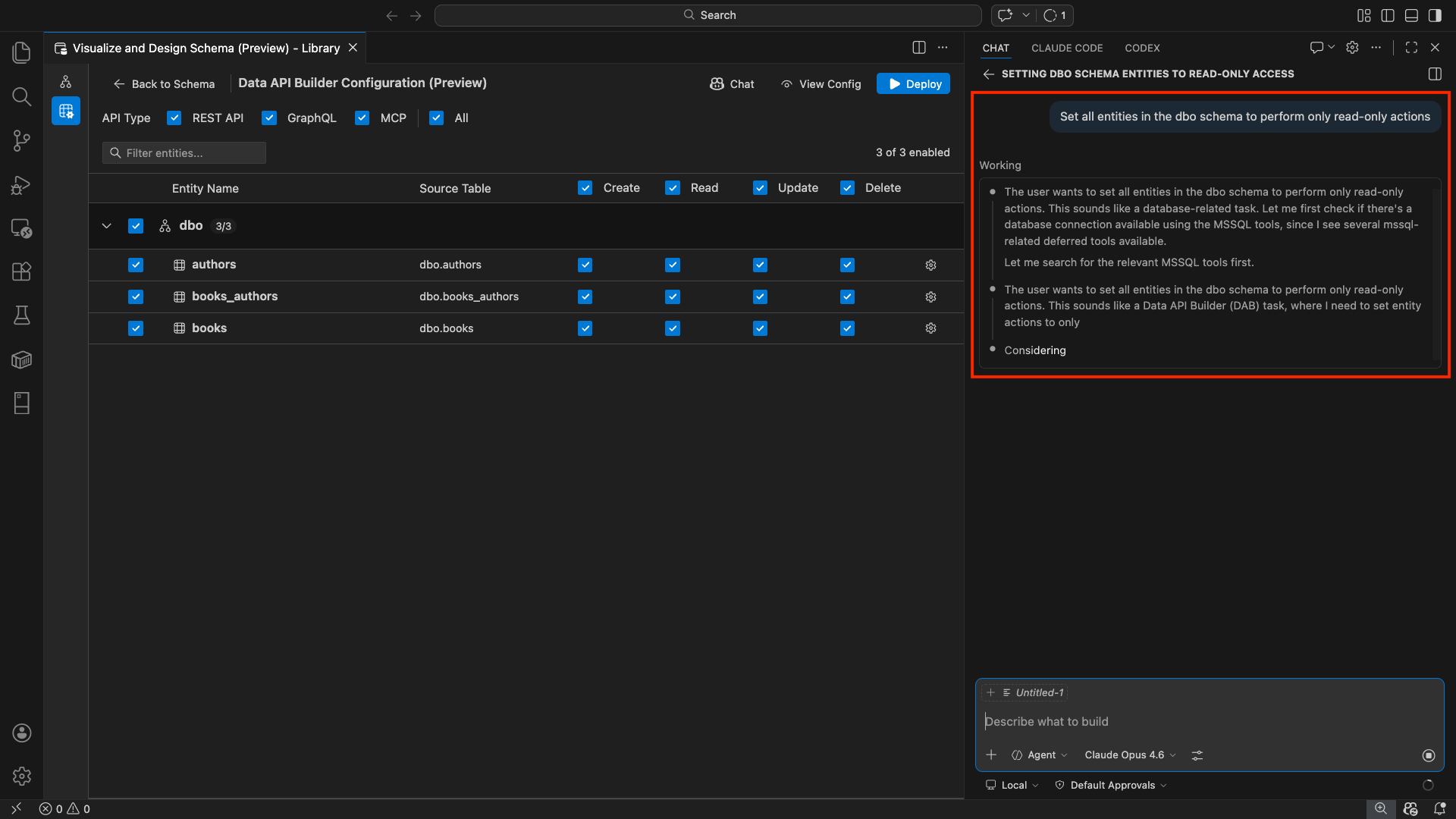 "Enable all SalesLT entities for read operations""Expose only the Customer and Product tables with full CRUD permissions""Set all entities in the dbo schema to read-only""Disable the BuildVersion and ErrorLog entities""Can you also enable MCP for the Data API builder API?"