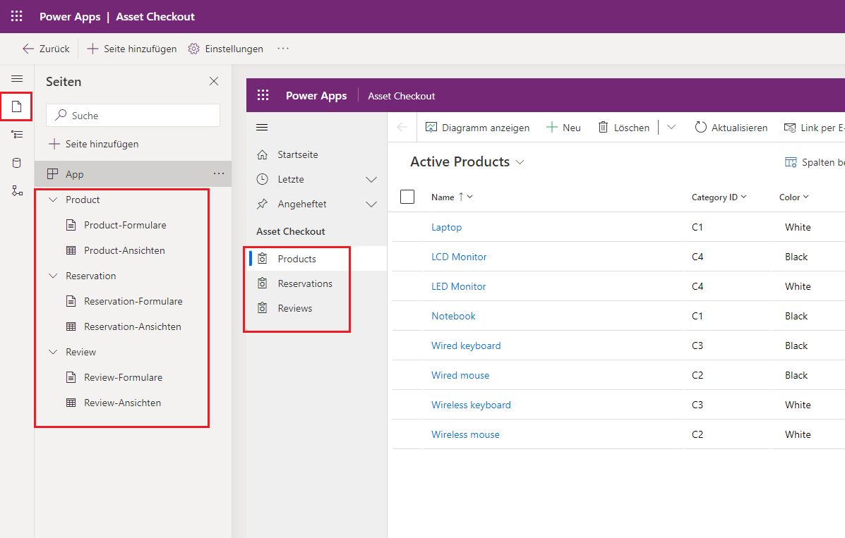 Wenn Sie Ihrer App Seiten hinzufügen, werden diese im Navigationsbereich angezeigt. Bei der Verwendung der App wird den Benutzern ein ähnlicher Navigationsbereich angezeigt, über den sie auf die verschiedenen Seiten in der App zugreifen können.