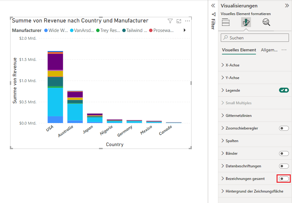 Beachten Sie, dass das Visual jetzt gefiltert wurde und die fünf führenden Hersteller nach „Summe von Revenue“ angezeigt werden. Der Hersteller VanArsdel, Ltd. in Australien weist einen höheren Prozentsatz der Verkäufe als andere Länder oder Regionen auf.