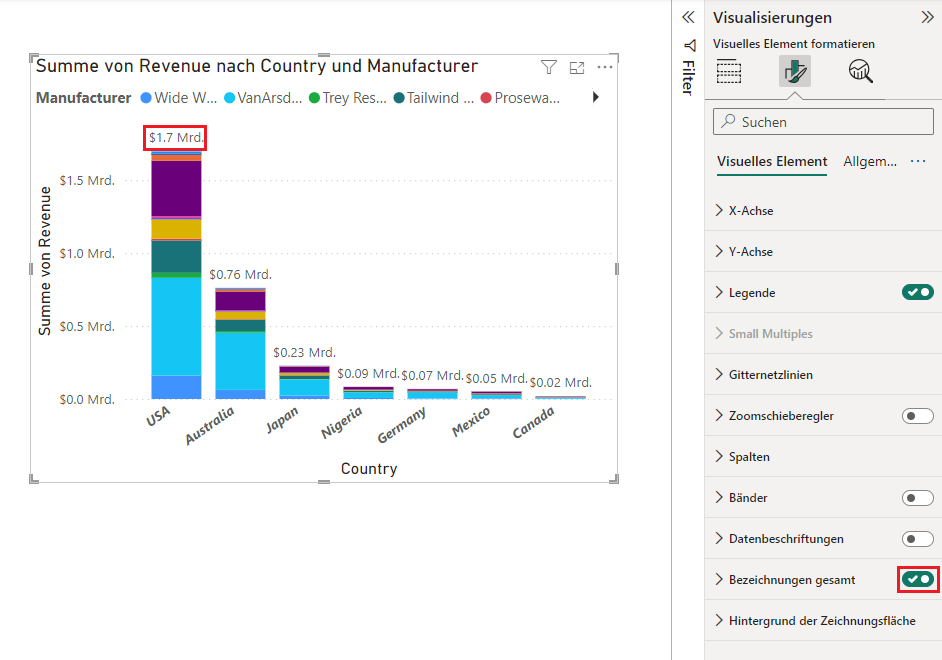 20. Entfernen wir nun die Beschriftungen mit den Gesamtzahlen. Über die Umschalteinstellung Ein/Aus neben Beschriftungen „Gesamt“ schalten Sie die Einstellung wieder Aus.