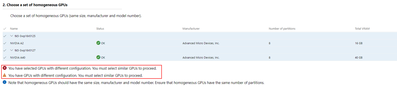 Warning. Wenn nicht alle GPUs auf allen Servern die gleiche Konfiguration haben, gibt Windows Admin Center eine Warnung aus. Sie müssen die GPUs mit der gleichen Konfiguration manuell auswählen, um fortzufahren.