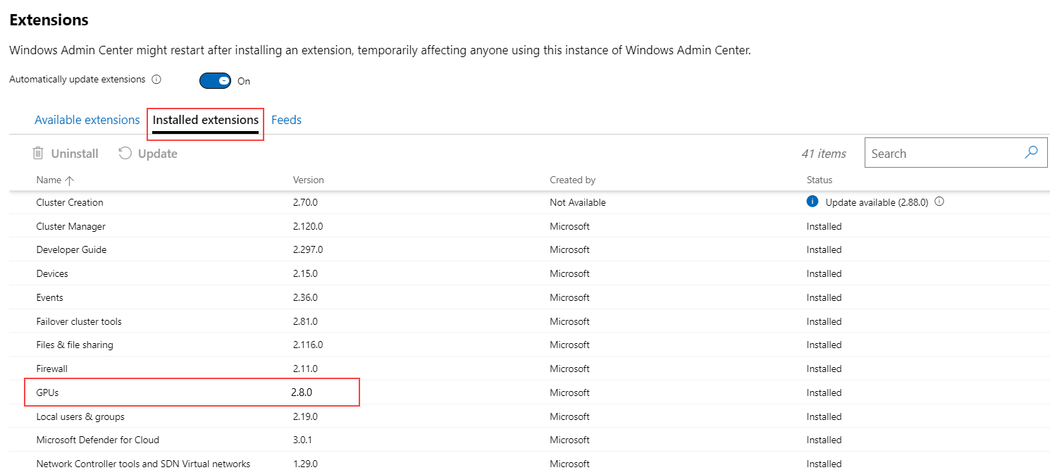 Wenn Sie Windows Admin Center zur Bereitstellung der GPU-Partitionierung verwenden, müssen Sie die neueste Version von Windows Admin Center mit der Erweiterung GPUs, Version 2.8.0 oder höher, installieren. Anweisungen zum Installieren der GPUs-Erweiterungen im Windows Admin Center finden Sie unter Installieren einer Erweiterung.