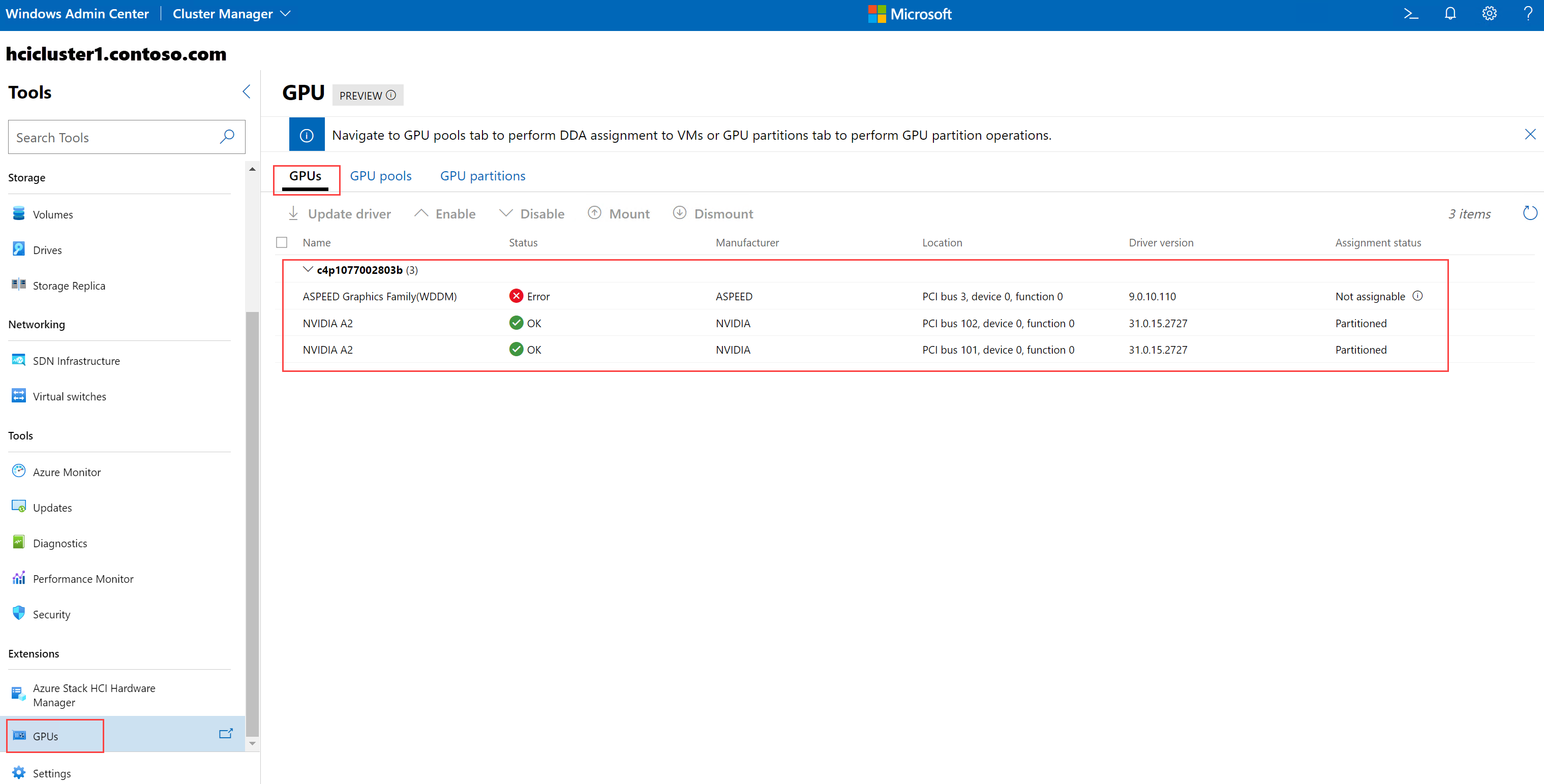Führen Sie die folgenden Schritte aus, um zu überprüfen, ob der GPU-Treiber installiert und über das Windows Admin Center partitionierbar ist: