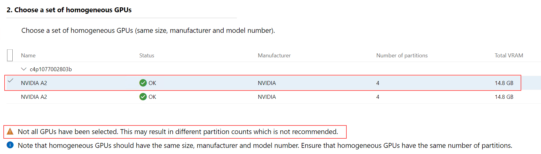 Warning. Wenn Sie eine oder mehrere GPUs aus dem homogenen Satz von GPUs abwählen, gibt Windows Admin Center eine Warnung aus, hält Sie aber nicht davon ab, weiterzumachen. Der Warntext weist darauf hin, dass Sie nicht alle GPUs auswählen und dass die Anzahl der Partitionen variieren kann, was nicht empfohlen wird.