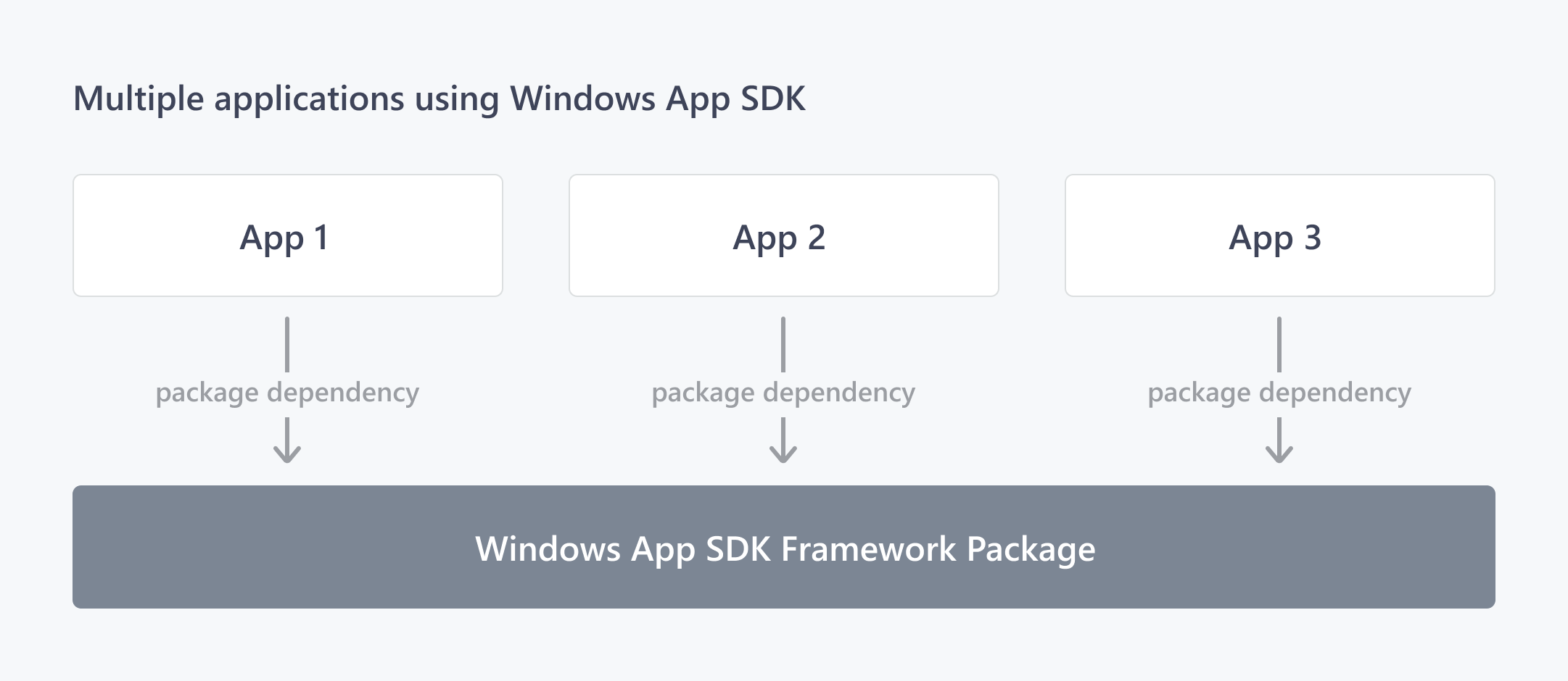 Das Windows App SDK Frameworkpaket ist ein MSIX-Paket, das endbenutzern über den Microsoft Store bereitgestellt wird. Es kann einfach und schnell mit Wartungsversionen aktualisiert werden, die Sicherheits- und Zuverlässigkeitskorrekturen umfassen können. Alle frameworkabhängigen Apps, die die Windows App SDK verwenden, weisen eine Abhängigkeit von einer freigegebenen Instanz des Frameworkpakets auf, wie im folgenden Diagramm dargestellt.