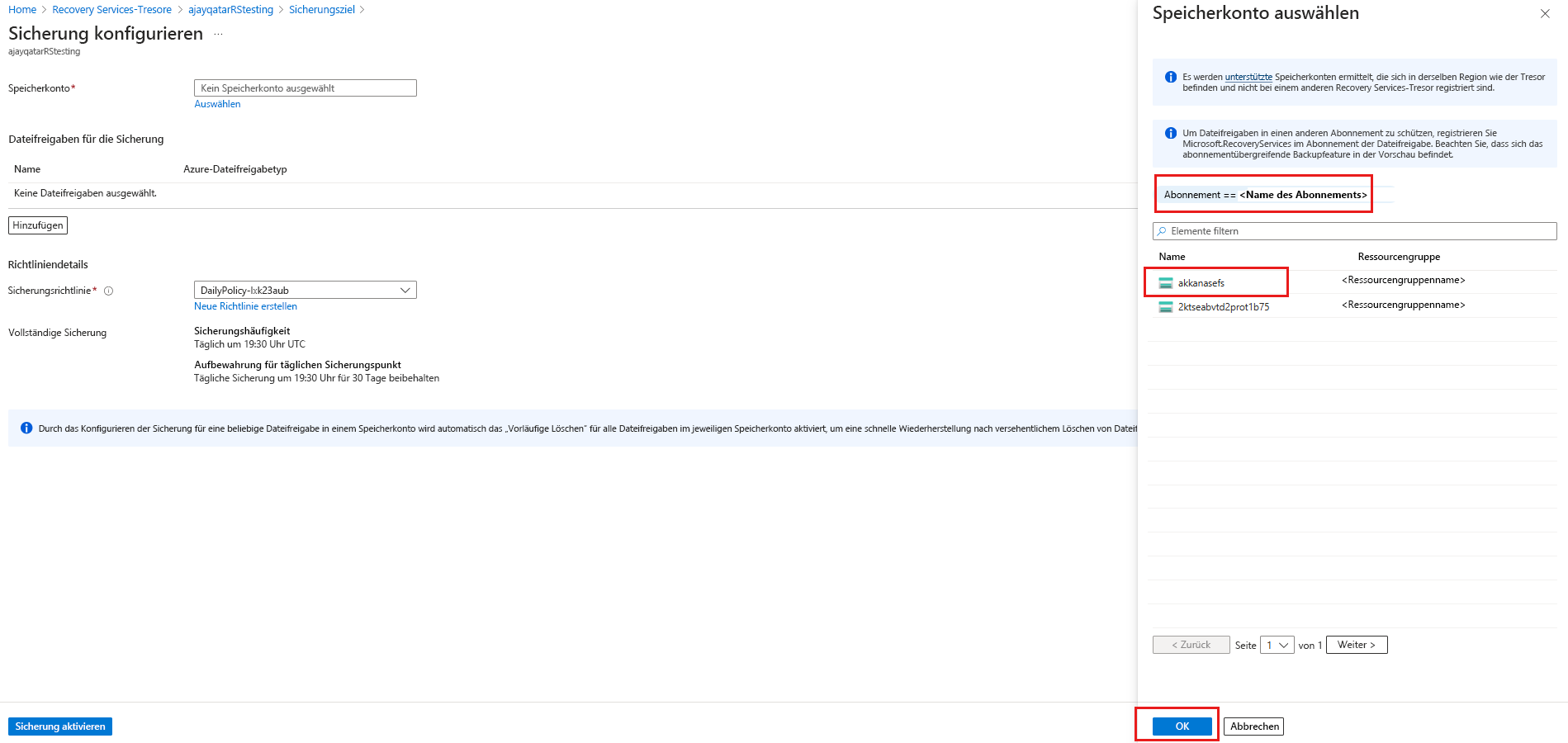 Wenn Sie den Sicherungsvorgang mit einem Speicherkonto in einem anderen Abonnement (Cross Subscription Backup) konfigurieren möchten, wählen Sie das andere Abonnement aus dem Abonnementfilter aus. Die Speicherkonten im ausgewählten Abonnement werden angezeigt.