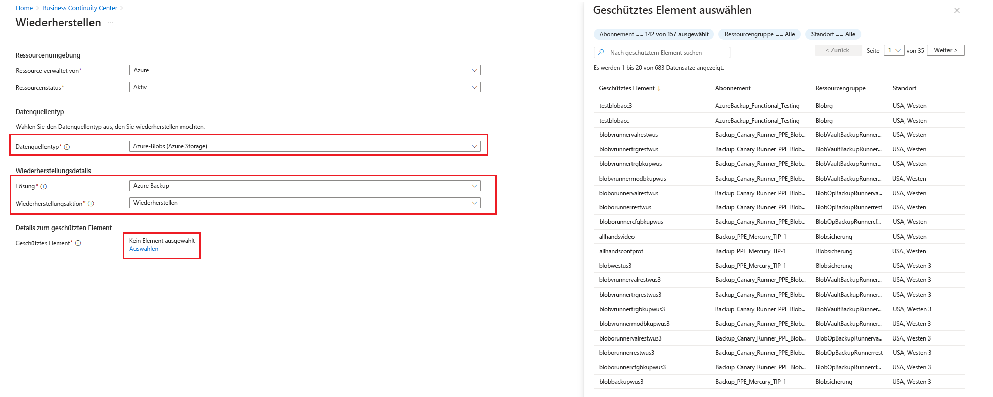 Wählen Sie im Bereich "Wiederherstellen" unter "Ressourcen verwaltet von" Azure Blobs (Azure Storage) als Datentyp aus, den Sie wiederherstellen möchten, und wählen Sie dann "Sicherung als Lösung" aus, über die Sie das Element wiederherstellen möchten. Klicken Sie auf "Auswählen" , um das Element auszuwählen, für das Sie die Wiederherstellungsaktion ausführen möchten.