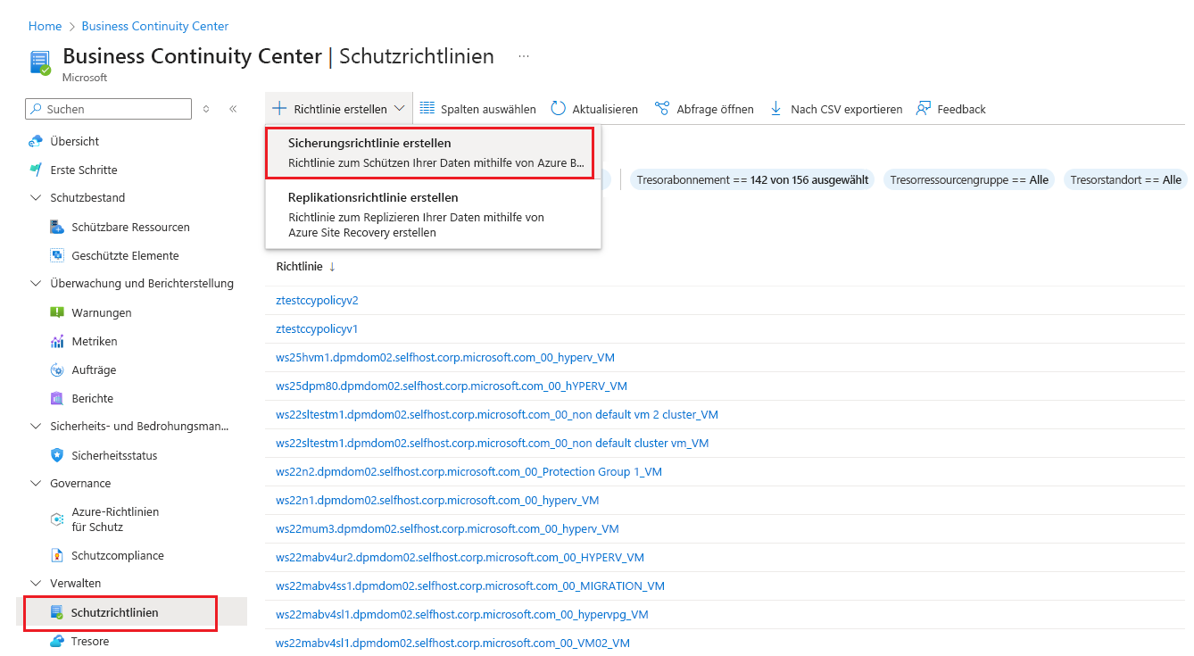 Wechseln Sie zu Resilienz>Schutzrichtlinien, und wählen Sie dann + Richtlinie erstellen>Sicherungsrichtlinie erstellen.