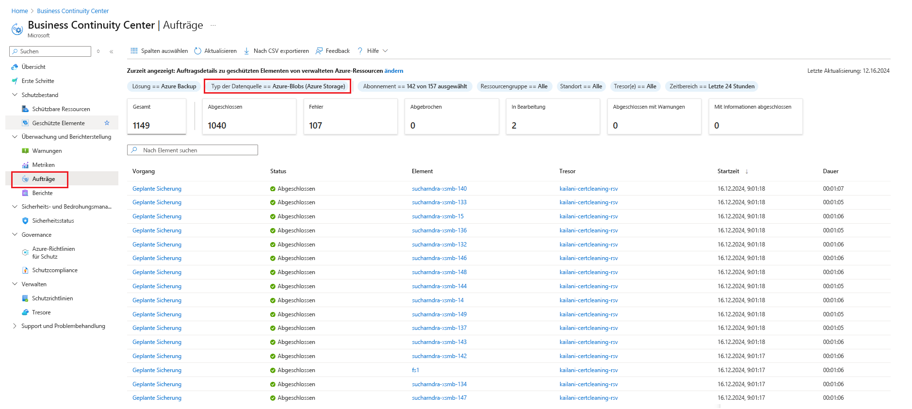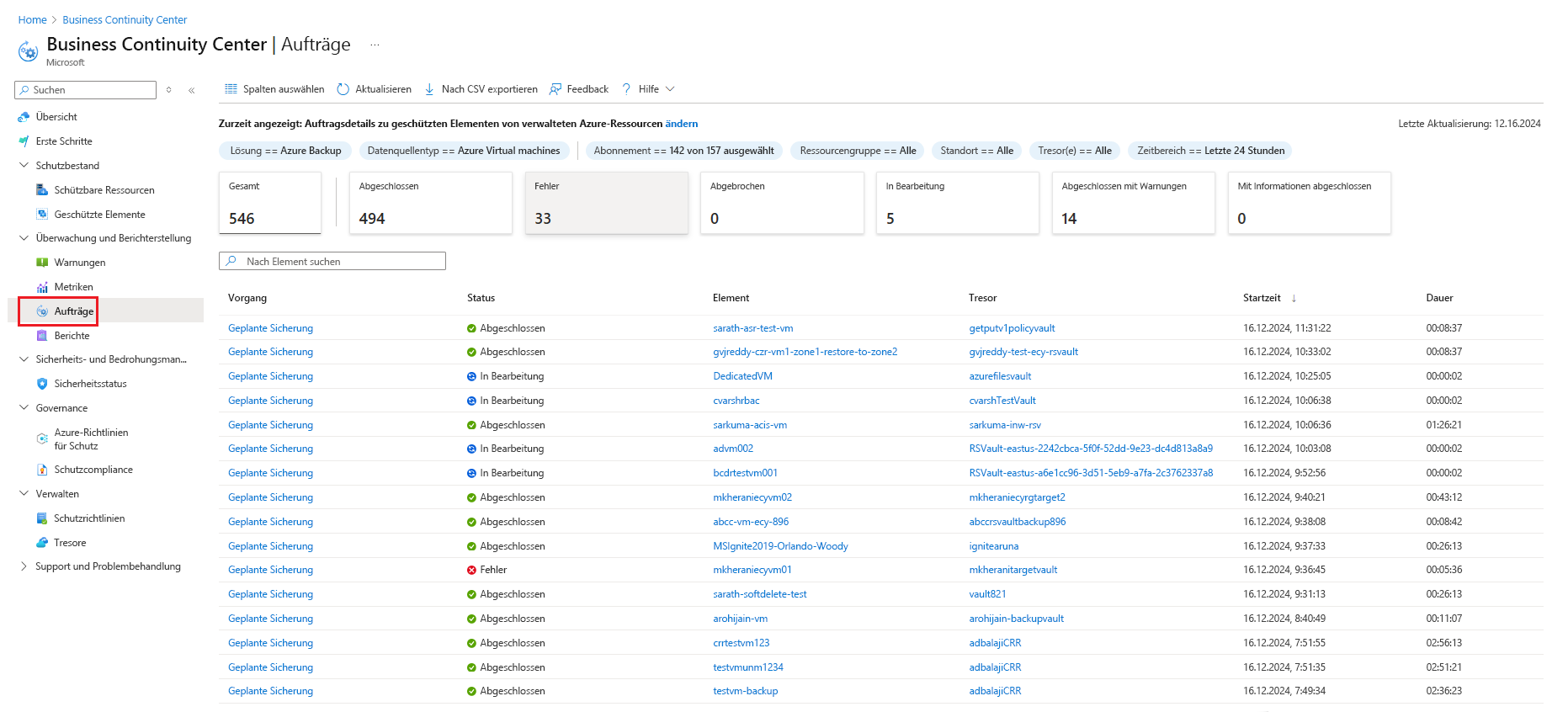 Wenn Sie einen Sicherungs- oder Wiederherstellungsvorgang auslösen, erstellt der Sicherungsdienst einen Auftrag zum Nachverfolgen. Sie können den Fortschritt aller Aufträge im Bereich "Aufträge " überwachen.