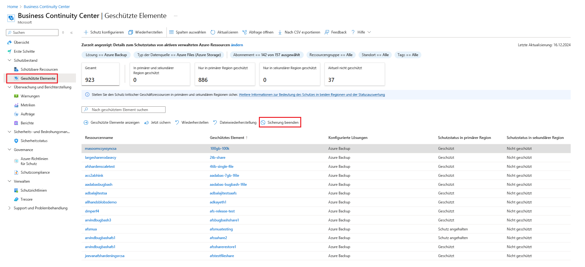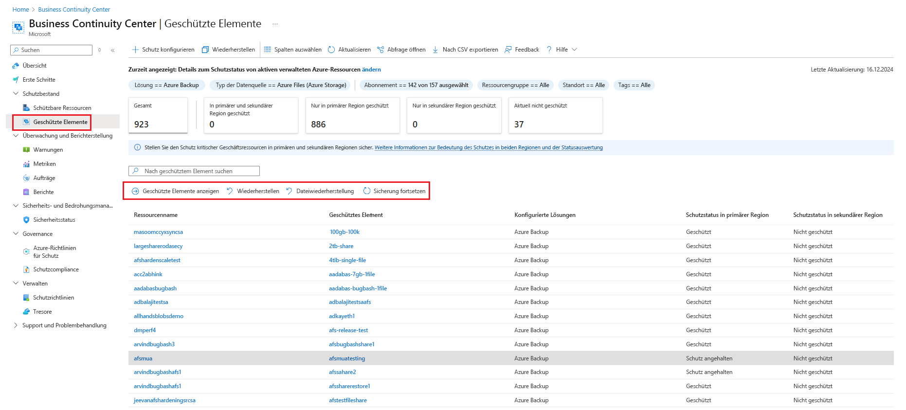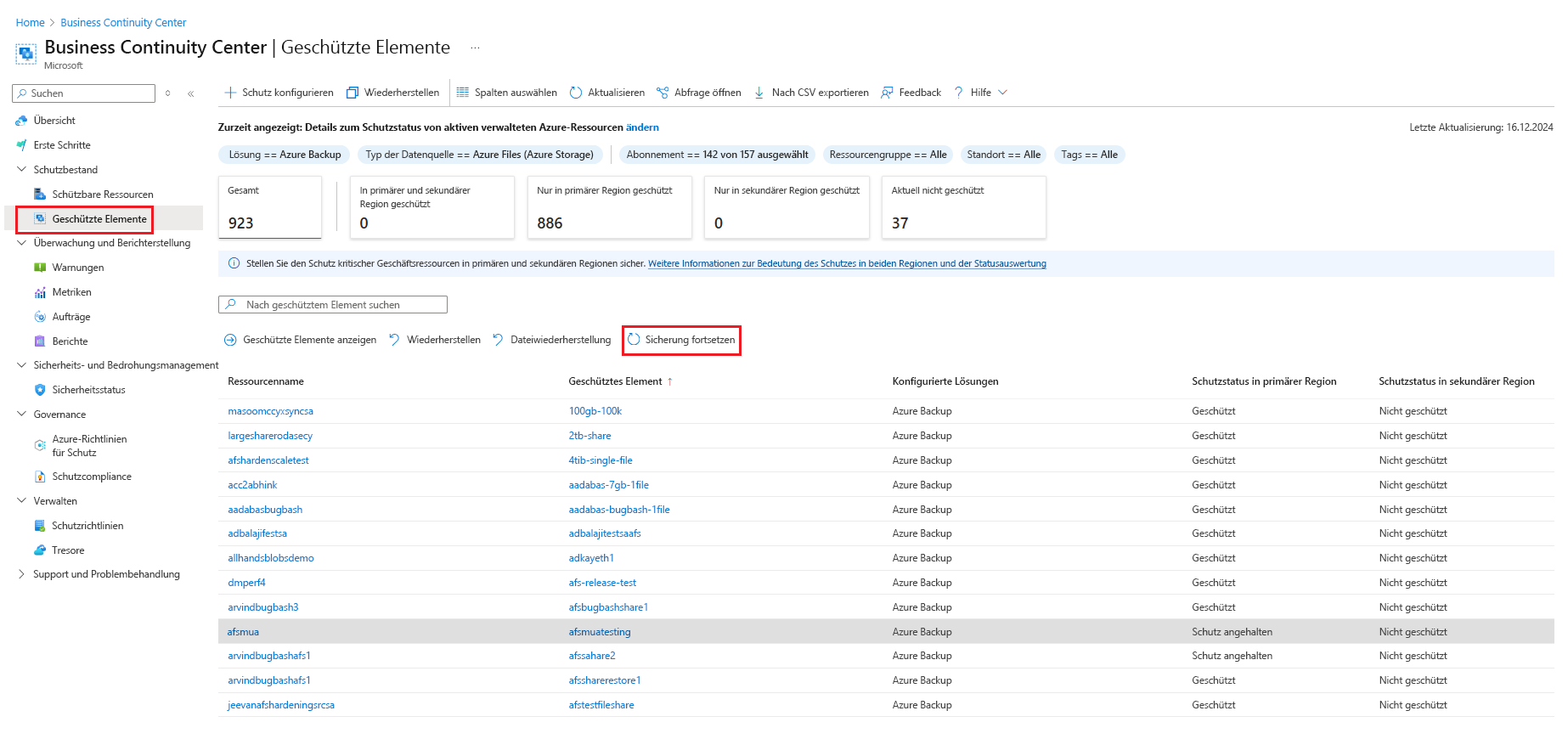 Wechseln Sie zu resilienzgeschützten>Elementen, und wählen Sie dann Azure Backup als Lösung und Azure Files (Azure Storage) als Datentyp aus.