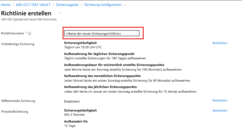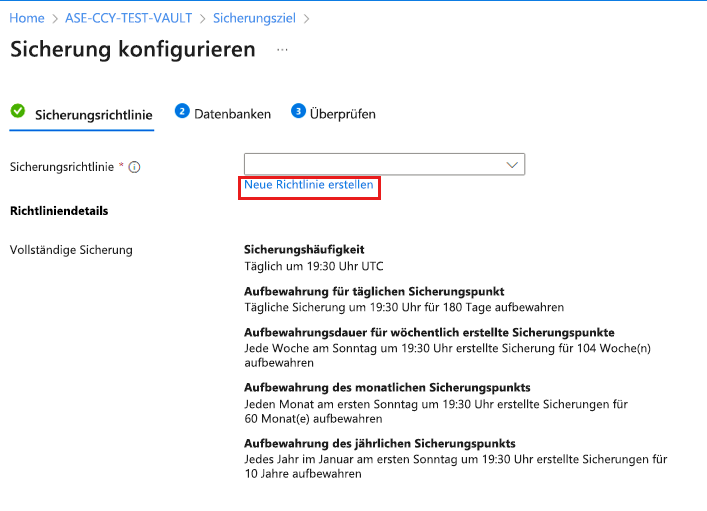 Wählen Sie unter "Sicherungsrichtlinie" die Option "Neue Richtlinie für die Datenbanken erstellen" aus.