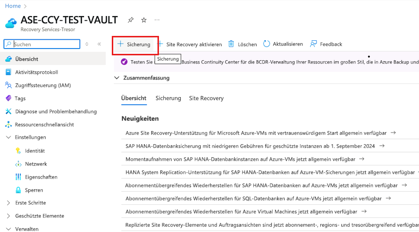 Bestimmen/erstellen Sie einen Recovery Services-Tresor in derselben Region und demselben Abonnement wie die beiden VMs/Knoten der SAP ASE Hochverfügbarkeitscluster-Datenbank.