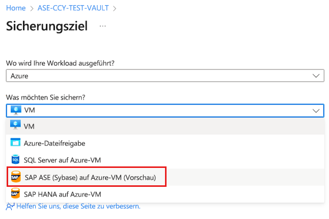 Wählen Sie im Sicherungszielsap ASE (Sybase) in Azure VM als Datenquellentyp aus.