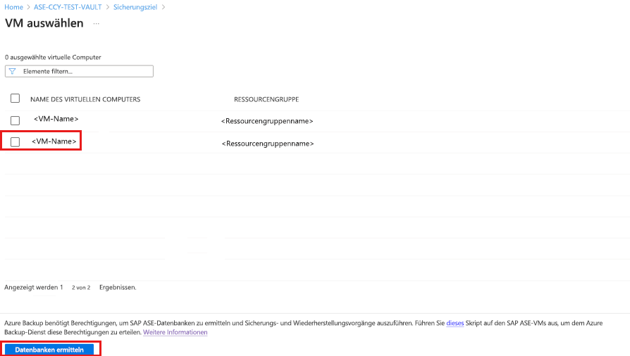 Azure Backup ermittelt alle SAP ASE-Datenbanken auf der VM. Während der Ermittlung registriert Azure Backup den virtuellen Computer beim Tresor und installiert eine Erweiterung auf dem VM. Für die Datenbank wird kein Agent installiert.