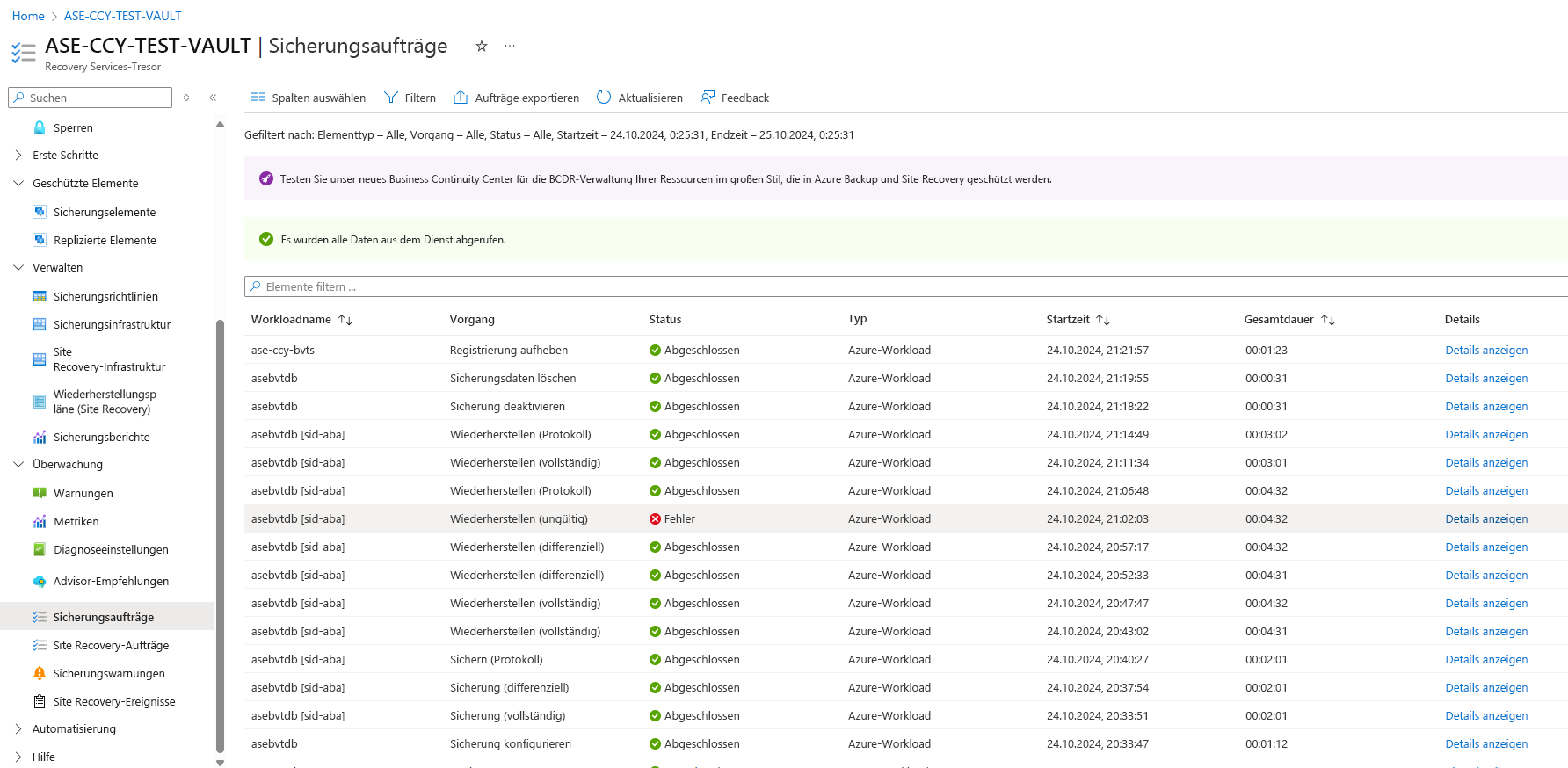 Azure Backup zeigt alle manuell ausgelösten Aufträge im Abschnitt „Sicherungsaufträge“ des Recovery Services-Tresors an.